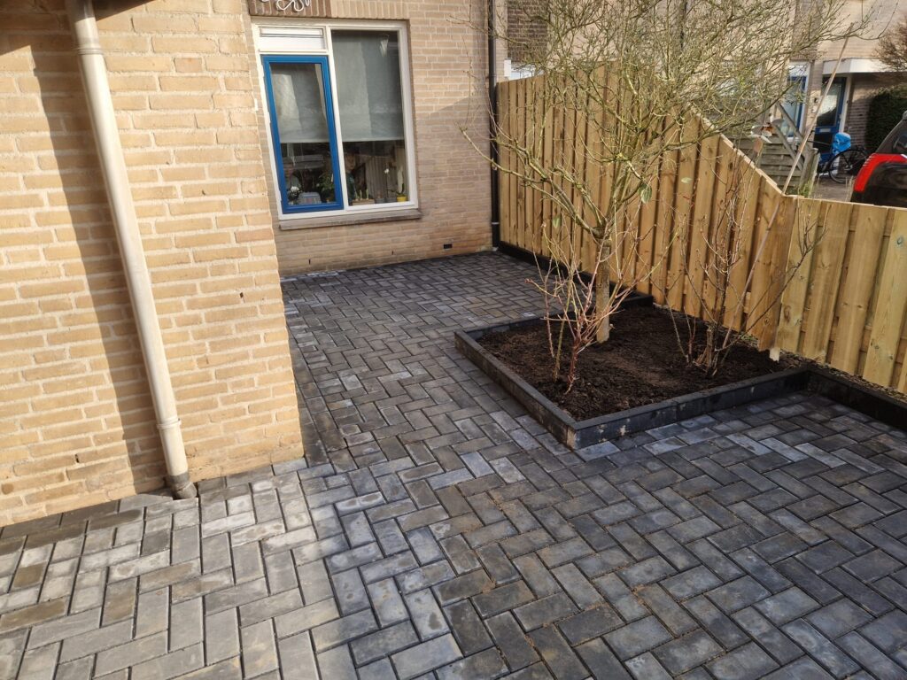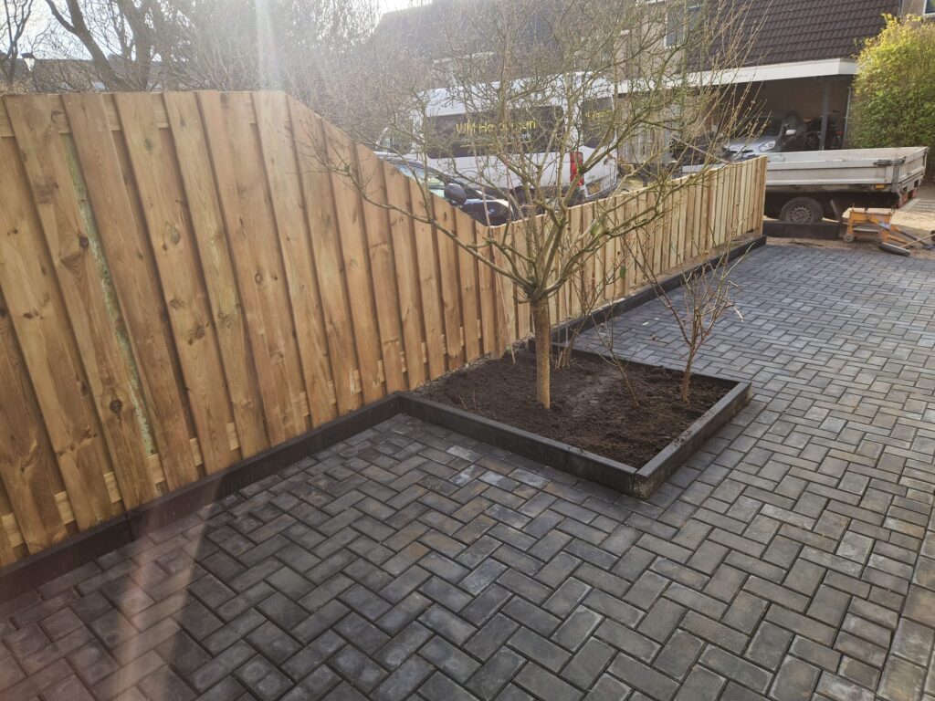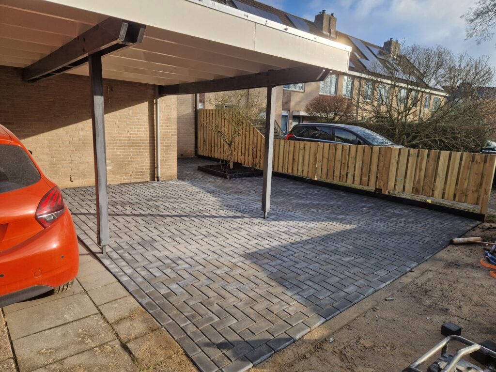 In Veenendaal een oprit bestraat met antraciet betonklinkers en een grenen schutting geplaatst.