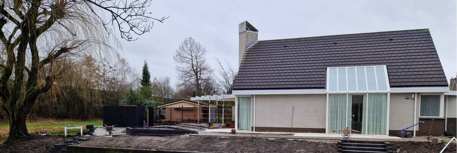 Op het gebied van houtbouw deze prachtige veranda mogen bouwen in een achtertuin in Ede. Ook gras aangelegd, (sier)tegels en de oprit bestraat.