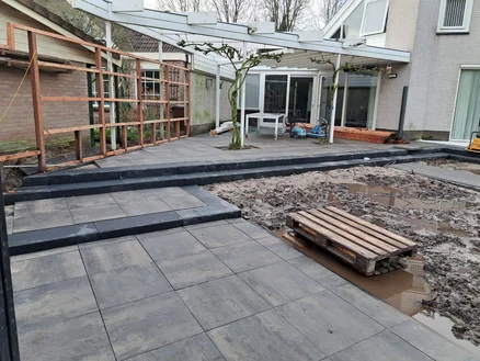 In Veenendaal een oprit bestraat met antraciet betonklinkers en een grenen schutting geplaatst.