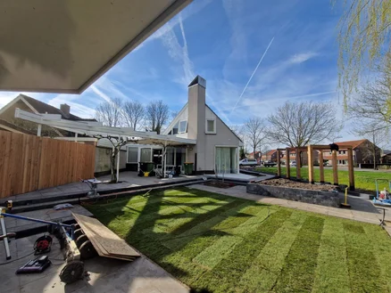 Op het gebied van houtbouw deze prachtige veranda mogen bouwen in een achtertuin in Ede. Ook gras aangelegd, (sier)tegels en de oprit bestraat.